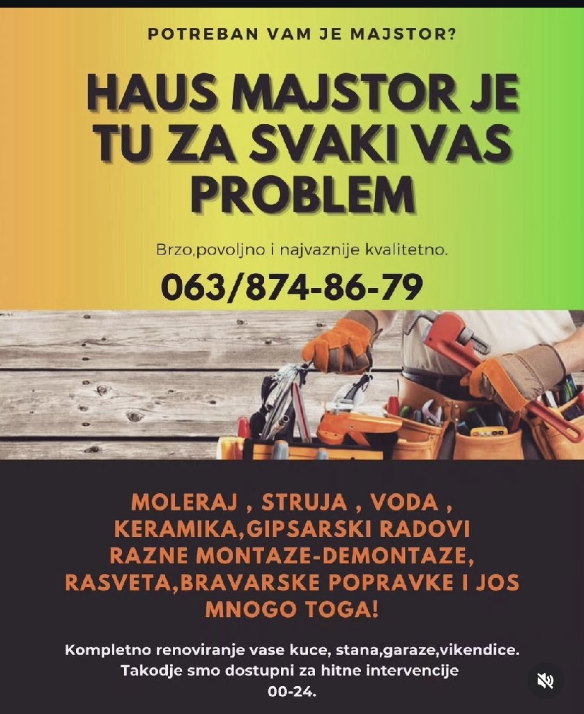 Sve sitne i krupne popravke montaze i demontaze, uz nase majstore svaki problem ima resenje. Takodje smo dostupni za hitne intervencije 00-24h na teritoriji celog Beograda. ----- 0638748679 ----- -Moleraj -Keramika -Gipsarski radovi -Elektricarski radovi -Vodovod - servis hidrofora i hidropaka, vodovodne instalacije. -Rasveta -Bravarske popravke -Popravke namestaja -NOVO U PONUDI - Rolo/Plise/Fiksni komarnici po porudzbini. I jos mnogo toga! Bavimo se kompletnim renoviranjem kuca,stanova,vikendica, garaza od plafona do poda. Radno vreme je 00-24 za sve informacije mozete pozvati na broj 0638748679. Brzo i povoljno, pozovite i uverite se! Radimo na teritoriji celog Beograda i svih okolnih mesta. Za svaki Vas problem mi imamo resenje! *Dodatne pogodnosti za penzionere,porodice sa decom i osobe sa posebnim potrebama* Sacuvajte broj, trebace vam! 🙂