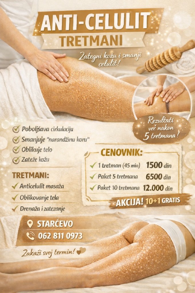 ✨ Vreme je da se osećaš bolje u svom telu ✨ Radim anticelulit masažu sa ciljem da koža bude glatkija, zategnutija i vidno poboljšana kroz ciklus tretmana. 💛 Individualan pristup svakom klijentu 💛 Rad po dogovoru – fleksibilni termini 💛 Diskretan i prijatan tretman bez žurbe 💛 Fokus na problematične regije (butine, stomak, zadnjica) 💛 Opuštena atmosfera – bez gužve i stresa