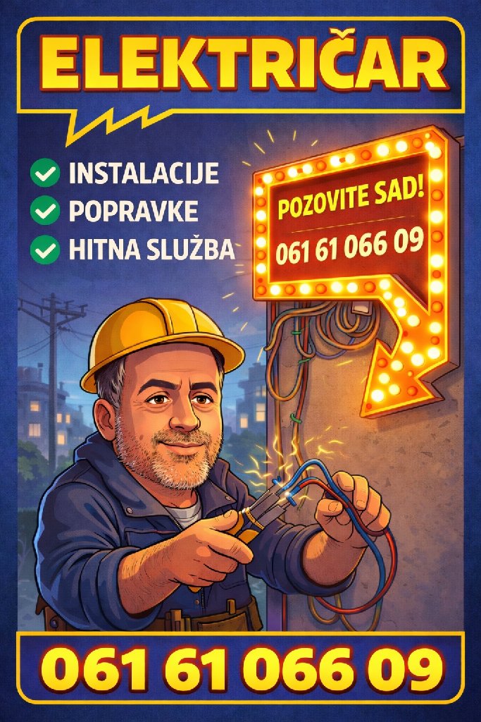 ⚡ ELEKTRIČAR – BRZA INTERVENCIJA 0-24 ⚡ Nestala struja? Iskače osigurač? Treperi svetlo? Pozovite majstora koji dolazi brzo i rešava problem odmah. 🔧 Radim sve vrste elektro radova: • Popravka i zamena utičnica i prekidača • Ugradnja LED rasvete i plafonjera • Zamena osigurača i razvodnih tabli • Izrada novih elektro instalacija • Popravka i ugradnja interfona • Pronalaženje i otklanjanje kvarova • Sitne i hitne elektro intervencije ✅ Brz dolazak ✅ Korektne cene ✅ Profesionalan rad ✅ Dugogodišnje iskustvo 💡 Vaš dom neka bezbedno zasija!