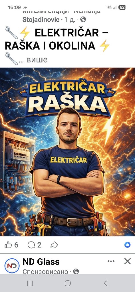 🔧⚡️ ELEKTRIČAR – RAŠKA I OKOLINA ⚡️🔧 Potrebna vam popravka ili nova elektro instalacija u kući ili stanu? Tu sam za sve vrste elektro i IT usluga: ⚡ Izrada novih elektro instalacija ⚡ Popravka i zamena starih instalacija ⚡ Zamena spratnih tabli i osigurača ⚡ Zamena utičnica i prekidača ⚡ Zamena i ugradnja rasvete ⚡ Interfoni ⚡ Sve vrste manjih kućnih elektro popravki ⚡ Jaka i slaba struja ⚡ Ugradnja i podešavanje video nadzora (kamere) 💻 SERVIS RAČUNARA I LAPTOPOVA: 🔹 Popravka računara i laptopova 🔹 Ubrzanje laptopa i računara 🔹 Optimizacija sistema 🔹 Zamena delova 🔹 Nadogradnja (RAM, SSD, itd.) 🔹 Instalacija operativnog sistema 🔹 Instalacija drajvera i programa 🔹 Čuvanje i backup podataka 🔹 Provera ispravnosti 🔹 Čišćenje i održavanje ✔ Brz dolazak ✔ Korektan dogovor ✔ Povoljne cene 📍 Raška i okolina 📞 Kontakt: Nemanja 065 4745534