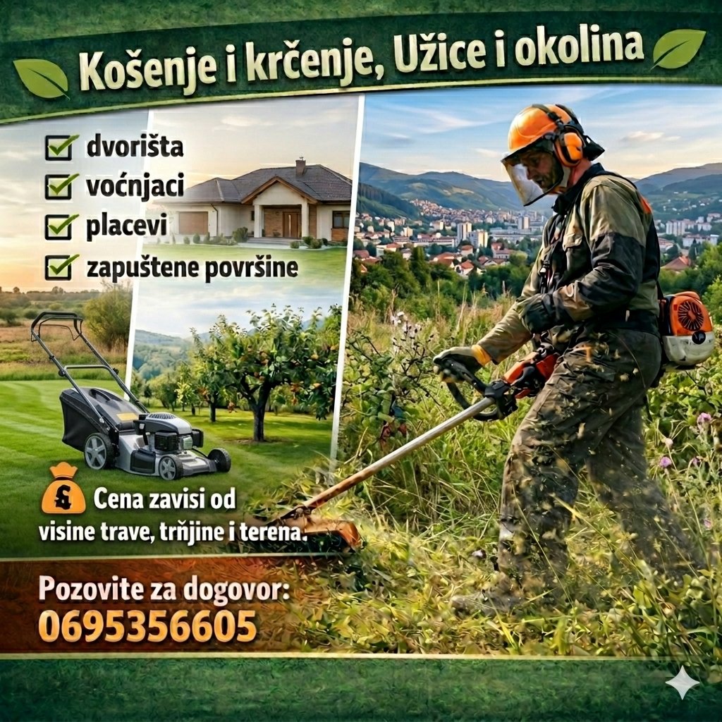 Dosadila vam je visoka trava i šiblje? Prepustite težak posao nama! Vršimo usluge košenja i krčenja trimerom na teritoriji Užica i okoline. Šta radimo: ✅ Košenje dvorišta i bašti ✅ Sređivanje zapuštenih voćnjaka ✅ Krčenje placeva zaraslih u trnje i šiblje ✅ Čišćenje svih vrsta zapuštenih površina Cena zavisi od visine trave, gustine trnja i same konfiguracije terena. Dolazimo na poziv, radimo pedantno i poštujemo dogovor!