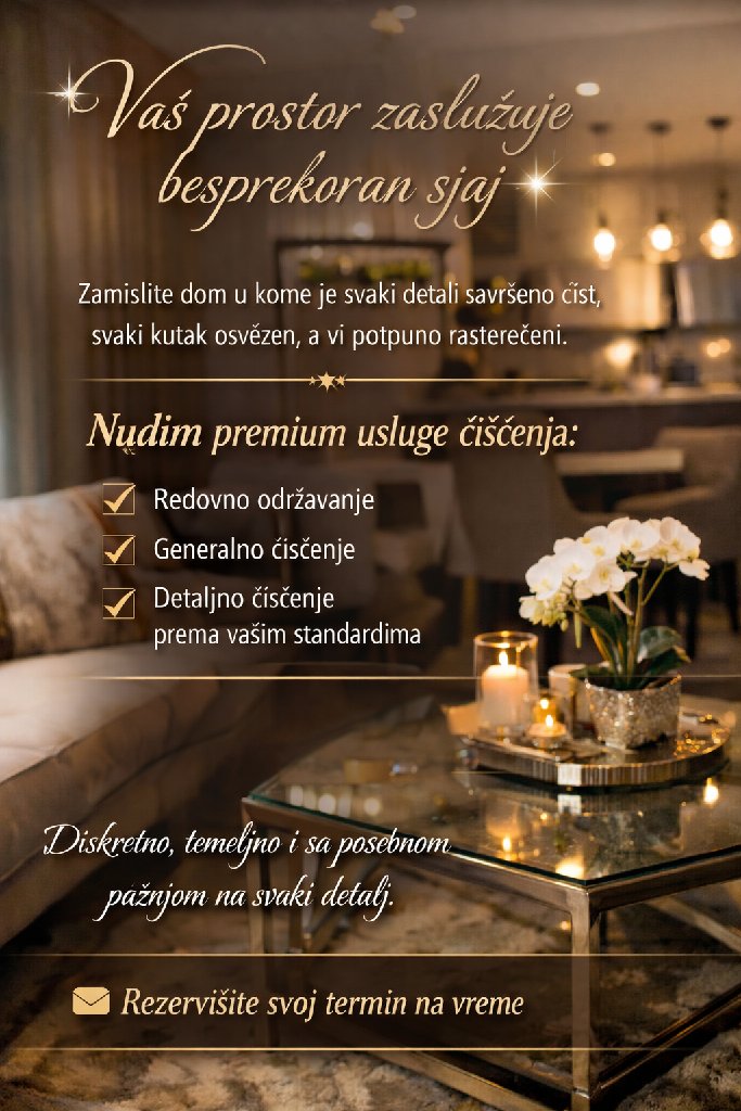 Prepustite čišćenje nekome ko to radi temeljno i sa pažnjom. ✨ Za veći sjaj ✨ Za čistiji i zdraviji prostor ✨ Za više slobodnog vremena 🧼 Nudim usluge: – redovnog održavanja – generalnog čišćenja – detaljnog čišćenja po vašim potrebama Pouzdano, odgovorno i bez žurbe – jer kvalitet se vidi. 📩 Pišite ili pozovite za dogovor