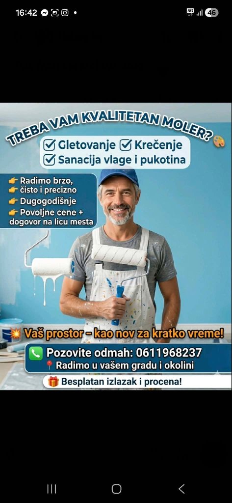 Sve vrste molerkih radova. Brzo i efikasno. Krecenje Gletovanje Gips Laminati i ostalo sto se tice podnih pokrivaca. Fasade.