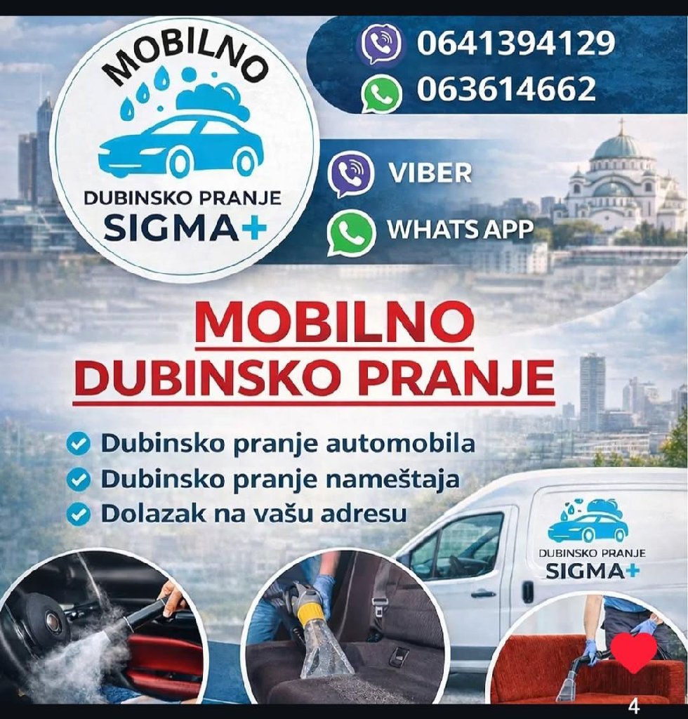 Mobilno dubinsko pranje automobila. Dok vi odmarate i uzivate u slobodnom vremenu ili ste u kancelariji, nas tim ce u najkracem roku detaljno oprati i srediti vaseg ljubimca. Susenje kompletnog automobila traje 2.5h. Na raspolaganju smo na teritoriji celog beograda, vase je samo da pozovete i zakažete termin, sve ostalo je nasa briga. Nudimo uslugu dezinfekcije i ciscenja kanala za klimu i ventilaciju u automobilu. Tretmani koze posebnim preparatima za te potrebe. Cistoca je pola zdravlja pa zbog toga pranje decijih sedista ide gratis uz pranje vozila. 0641394129 063614662